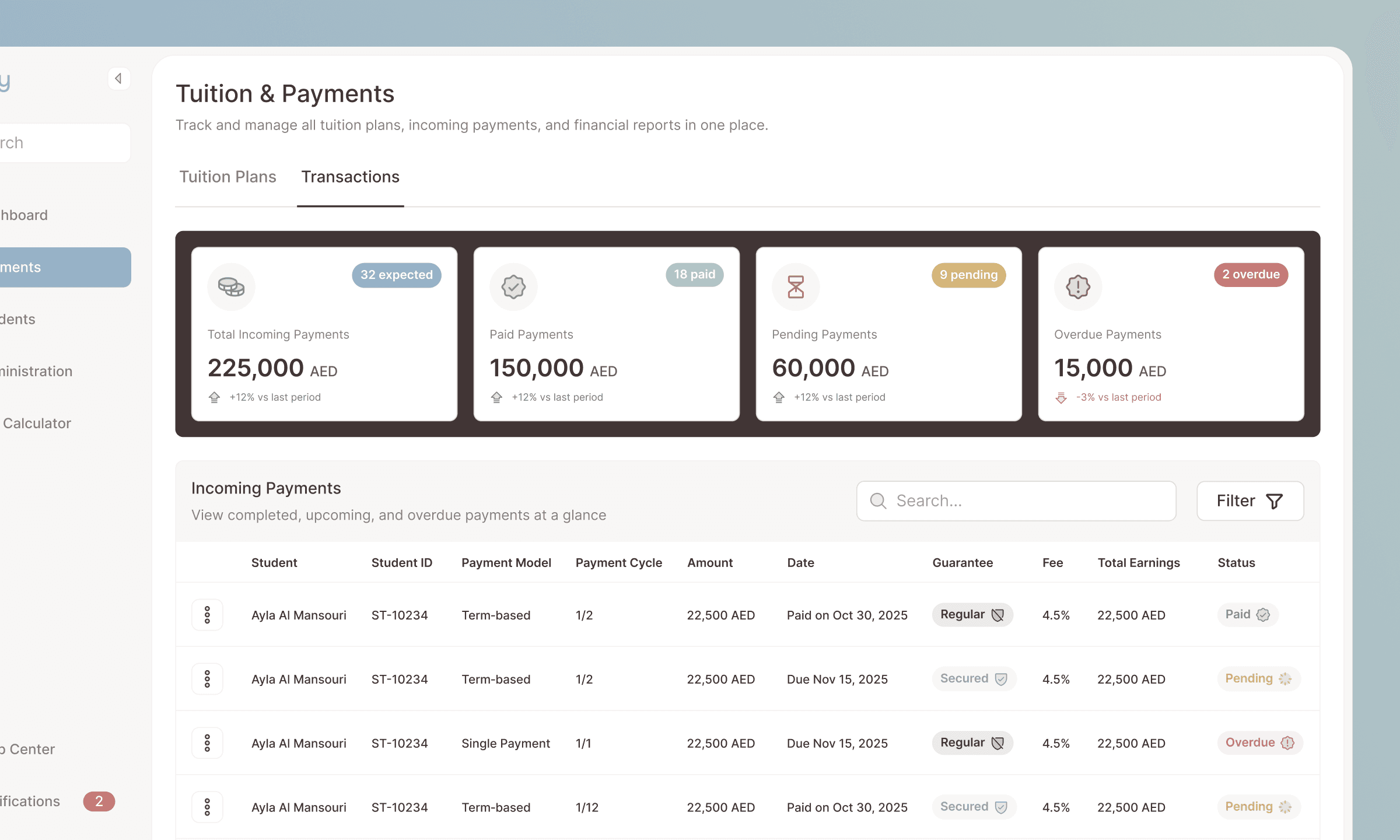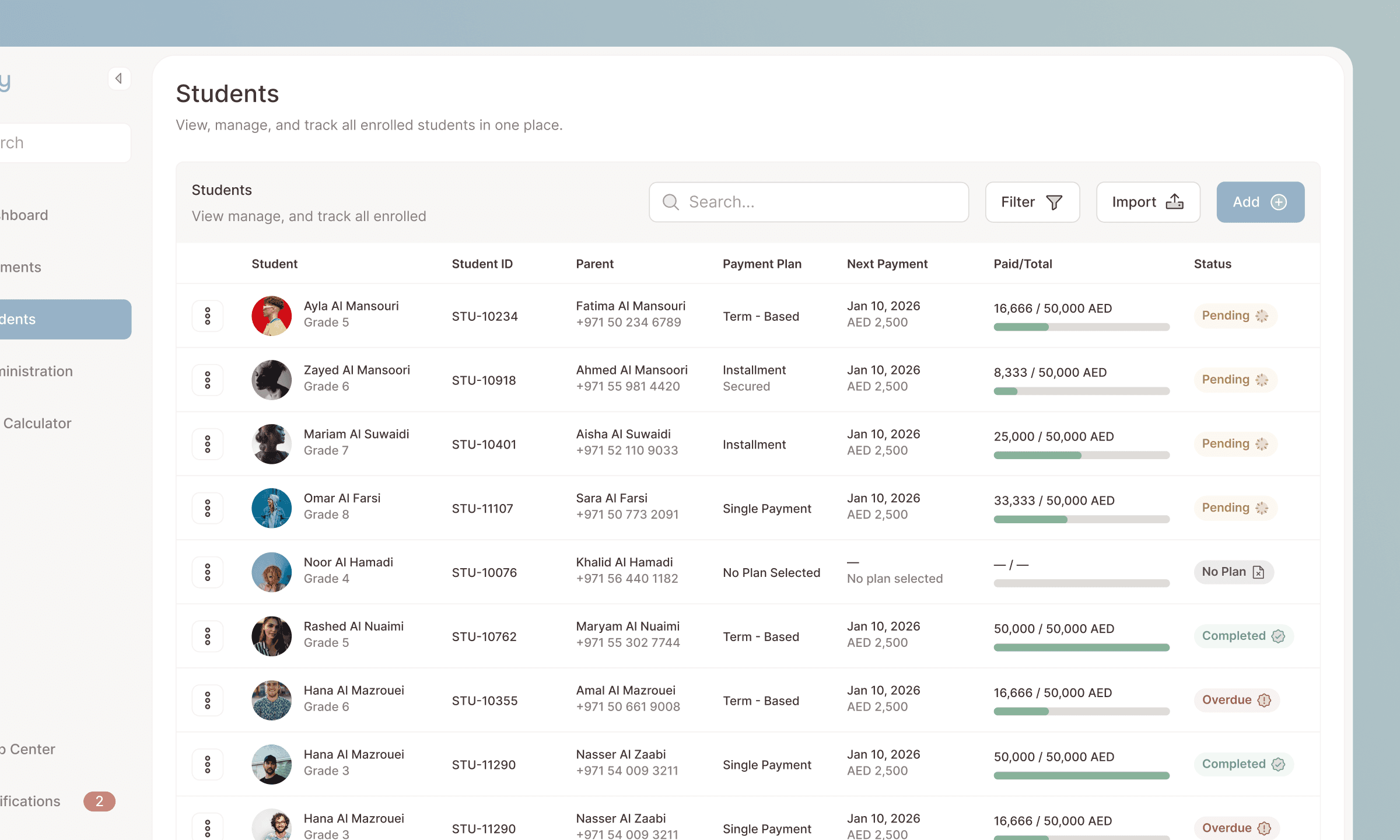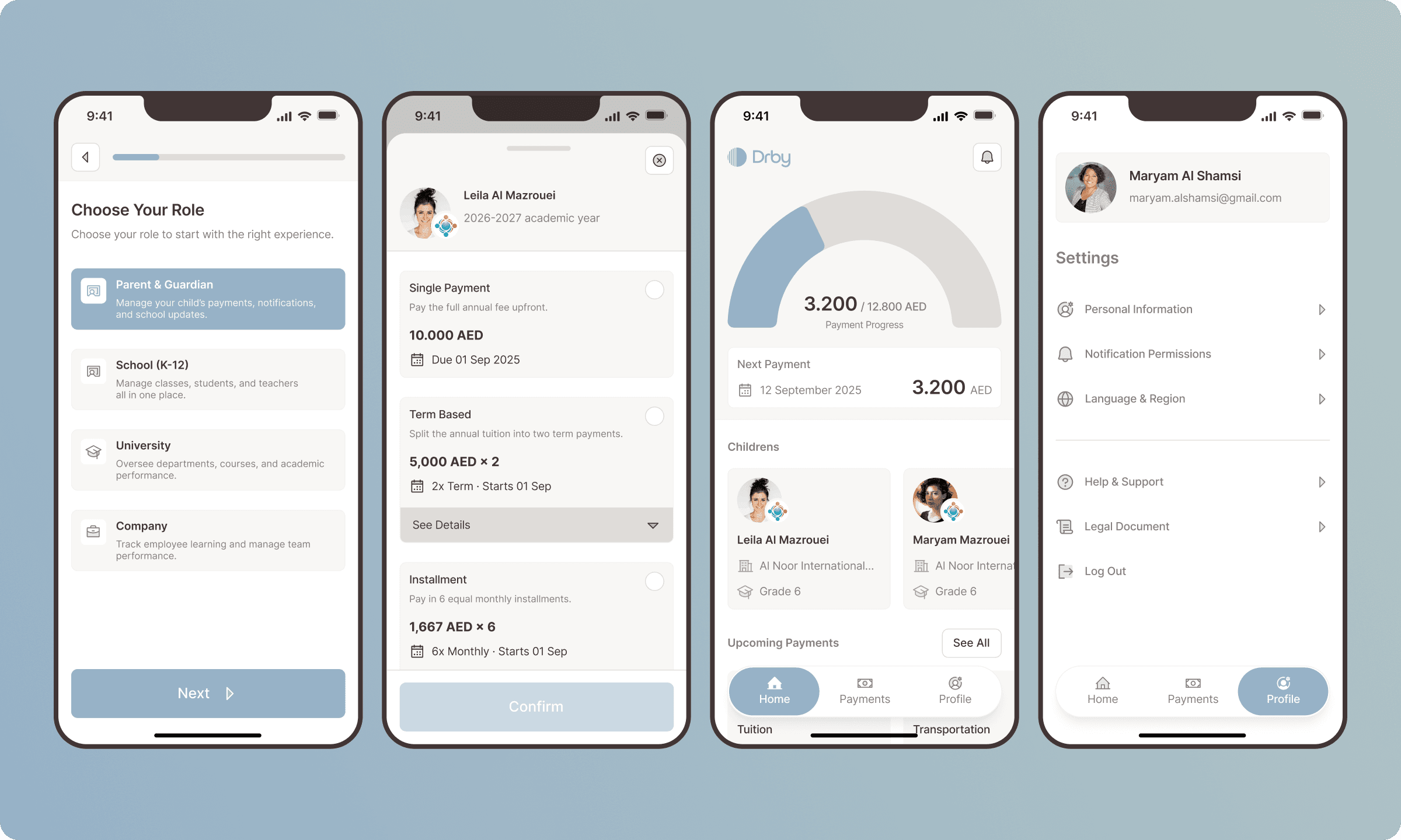 End-to-end product design covering brand, mobile and web for a multi-role education fintech platform used by parents, schools and sponsors.